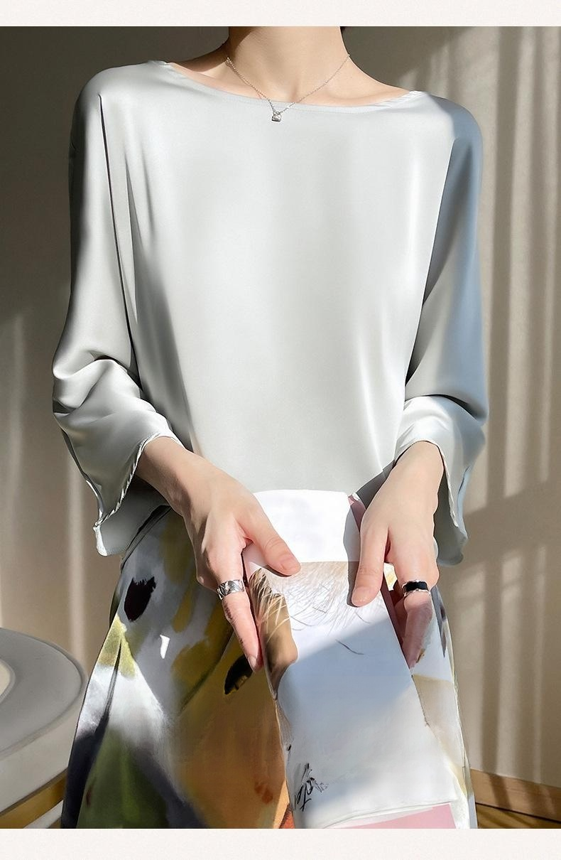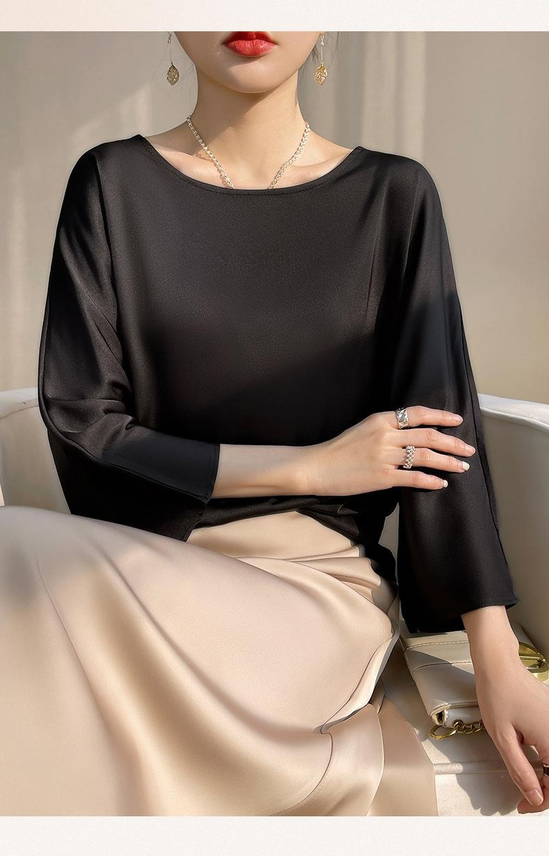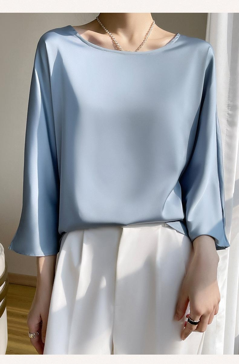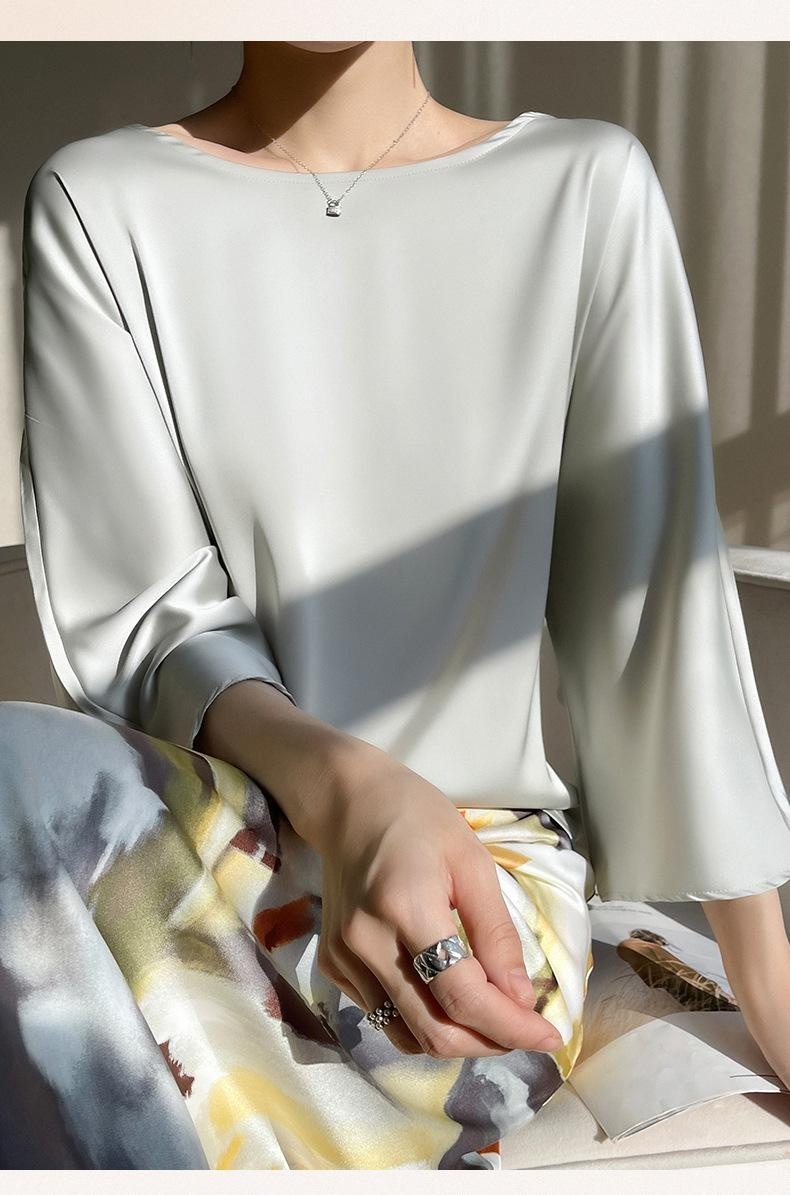실크 뽕나무 실크 패션 상의 반팔 티셔츠 여 여름 코디 초산 새틴 반팔 상의 얇은 디자인감