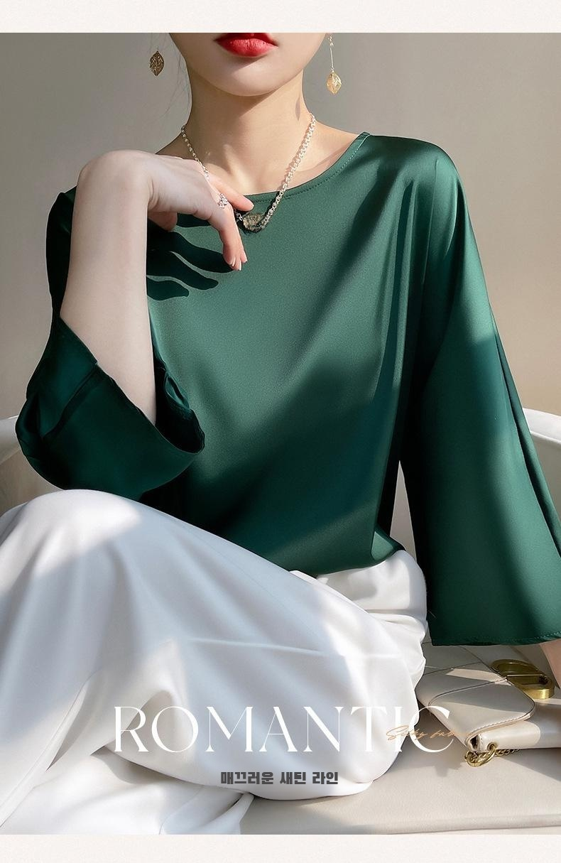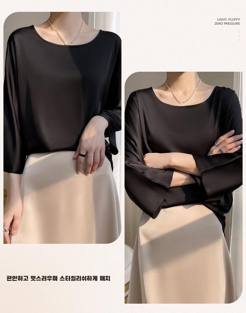 여성 여름 패션 초산 새틴 반팔 상의 착용샷